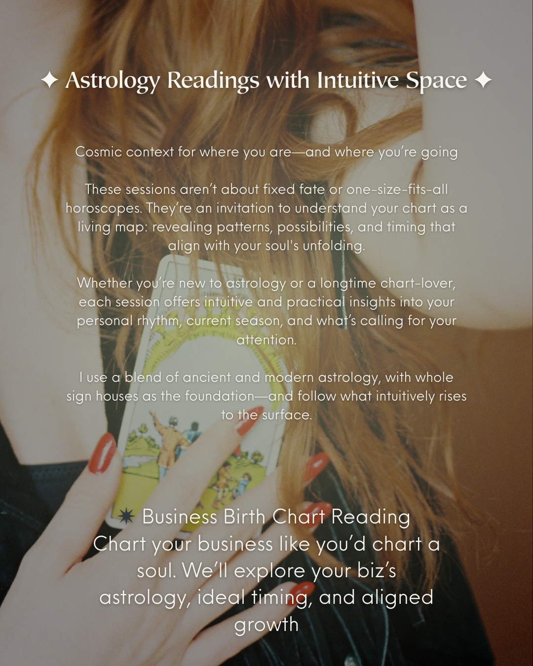 Store Recorded Readings from $66.00 Select Readings 30-Minute Chart Reading 60-Minute Full Birth Chart Reading Business Birth Chart Reading Astrocartography 30-Minute Clarity Pull 60-Minute Deep Dive A Wheel of the Year Add To Cart Added!